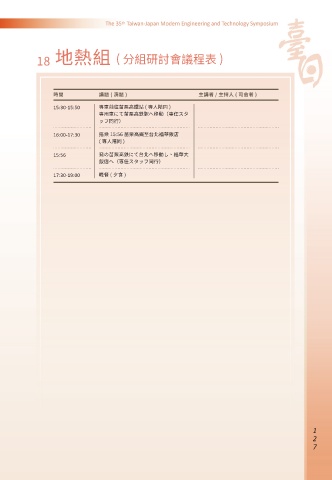 18 地熱組 ( 分組研討會議程表 ) 時間 講題 ( 演題 ) 主講者 / 主持人 ( 司会者 ) 15:30-15:50 專車前往苗栗高鐵站 ( 專人陪同 ) 専用車にて苗栗高鉄駅へ移動(専任スタ ッフ同行) 16:00-17:30 搭乘 15:56 苗栗高鐵至台北福華飯店 ( 專人陪同 ) 15:56 発の苗栗高鉄にて台北へ移動し、福華大 飯店へ(専任スタッフ同行) 17:30-19:00 晚餐(夕食) 1 2 7