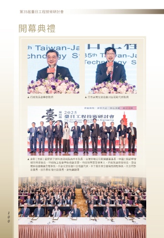 開幕典禮 ▶ 行政院長卓榮泰致詞 ▶ 日本台灣交流協會川合現副代表致詞 ▶ 合影 ( 左起 ) 國家原子能科技研究院高梓木院長、台灣世曦公司鄭運鵬董事長、中國工程師學會 楊宗興理事長、行政院工程會李怡德副主委、行政院李慧芝發言人、行政院卓榮泰院長、臺日 關係協會蘇嘉全理事長、日台交流協會川合現副代表、中工會日本分會楊馬田理事長、日方阿部 忠團長、日方長坂 徹也副團長、謝牧謙顧問 1 0 0