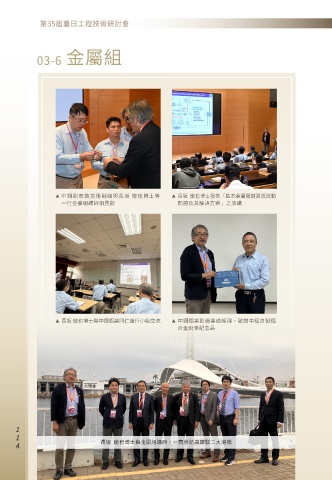 03-6 金屬組 ▶ 中鋼劉宏義技術副總與長坂 徹也博士等 ▶ 長坂 徹也博士發表「基本金屬關鍵資源流動 一行金屬組講師相見歡 問題及其解決方案」之演講 ▶ 長坂 徹也博士與中鋼鋁業同仁進行小組交流 ▶ 中鋼鋁業彭偉業總經理,致贈中鋁自製鋁 合金雨傘紀念品 1 1 0 長坂 徹也博士與金屬組講師,一齊參訪高雄駁二大港橋