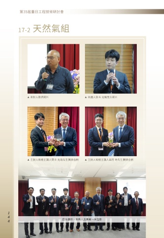 17-2 天然氣組 ▶ 主持人致詞照片 ▶ 主講人熨斗 克哉先生照片 ▶ 主持人致贈主講人熨斗 克哉先生獎牌合照 ▶ 主持人致贈主講人四方 寿先生獎牌合照 1 0 0 日方講師、主持人及貴賓一同合影