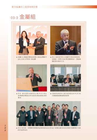 03-3 金屬組 ▶ 金屬中心劉嘉茹董事長致贈大會紀念獎牌予 ▶ 鈴木 裕社長於第 35 屆臺日工程技術研討會 - WELCON 公司鈴木 裕社長 金屬組,分享 PCHE 熱交換器設計、測試與 擴散接合製作方法 ▶ 鈴木 裕社長於分組研討分享 PCHE 熱交 ▶ 分組研討與鈴木 裕社長深度交流 PCHE 熱 換器擴散銲接技術在微流道結構製造的 交換器擴散銲接製程技術 應用 1 0 ▶ 鈴木 裕社長、齋藤隆常務取締役營業部長及石田 祐介經營企劃室長與技術研發團隊於分組 0 研討合影留念