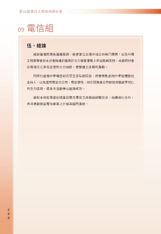 09 電信組 伍、結論 感謝籌備期間各籌備委員、秘書單位台灣中油公司執行團隊,以及中國 工程師學會日本分會陳建和委員於日方聯繫事務上的協助與支持。本屆研討會 亦獲得日方多位主管的大力相挺,使雙邊交流順利推動。 同時也感謝中華電信研究院王景弘副院長、經營規劃處胡仲華協理擔任 主持人,以及國際電信分公司、電信學院、研究院與總公司經營規劃處等同仁 的全力協助,使本次活動得以圓滿成功。 期盼未來能再度促成臺日雙方專家之技術與經驗交流,持續深化合作, 共同推動我國電信產業之升級與國際連結。 0 0 0