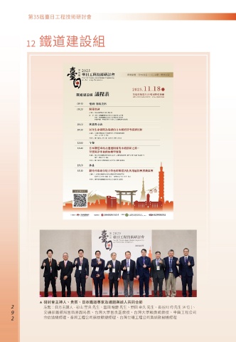 12 鐵道建設組 ▶ 研討會主持人、貴賓、日本鐵道專家及議題與談人共同合影 0 左起:日方主講人 - 衫山 空央 先生、雲田 昭慶 先生、野田 幸久 先生、長谷川 均 先生 (4 位 )、 0 交通部鐵道局呂新喜副局長、台灣大學呂良正教授、台灣大學賴勇成教授、中興工程公司 0 余信遠總經理、泰興工程公司蘇紋騏總經理、台灣世曦工程公司黃炳勳副總經理