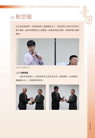 15 航空組 決定其檢查頻率。也舉例說明小型機場航班少,相對會有比較多的時間可 進行維護;設有多條跑道之大型機場,則會因為航班密集,維修時間則相對 壓縮。 ▶ 參與人員意見交流 ( 三 ) 致贈講座 由航空組召集人(民用航空局方副局長志文)致贈講座,並與講師、 兩議題主持人、成員等合影留念。 0 0 0
