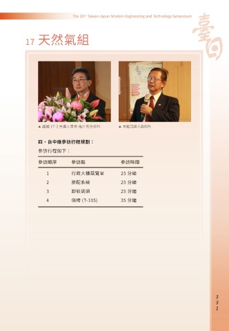 17 天然氣組 ▶ 議題 17-3 主講人青栁 祐介先生照片 ▶ 本組口譯人員照片 四、台中廠參訪行程規劃: 參訪行程如下: 參訪順序 參訪點 參訪時間 1 行政大樓展覽室 25 分鐘 2 摻配系統 25 分鐘 3 卸收碼頭 25 分鐘 4 儲槽 (T-105) 35 分鐘 0 0 1