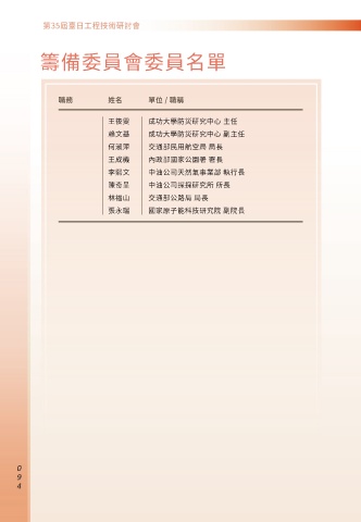 籌備委員會委員名單 職務 姓名 單位 / 職稱 王筱雯 成功大學防災研究中心 主任 賴文基 成功大學防災研究中心 副主任 何淑萍 交通部民用航空局 局長 王成機 內政部國家公園署 署長 李熙文 中油公司天然氣事業部 執行長 陳奇呈 中油公司探採研究所 所長 林福山 交通部公路局 局長 張永瑞 國家原子能科技研究院 副院長 0 0 0
